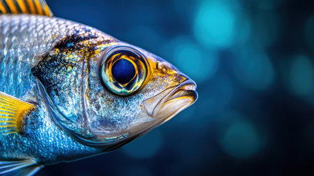 A close-up view presents a fish showcasing intricate scale patterns and textures. The fish resides within a marine environment featuring coral formations. Dark blue and teal hues dominate the color palette. This image may be utilized for educational resources or various design applications.