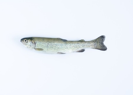 Aerial shot of a rainbow trout on white background.