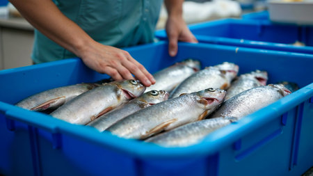Fresh fish in a blue tray - industrial ocean fish catch. Generative AI