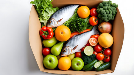 A cardboard box filled with fresh seafood, including fish, and an assortment of colorful fruits and vegetables.