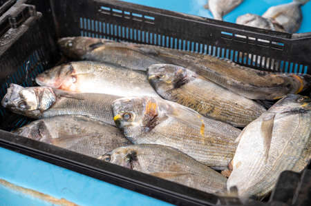 Catch of the day for sale on daily fish market in old port of Marseille, Provence, France. Fresh fish in assortment.