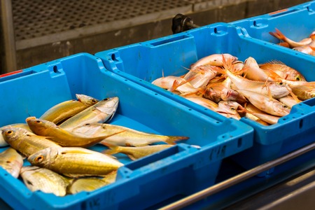 Freshly caught fish sorted in crates with ice for transport and sale at dock
