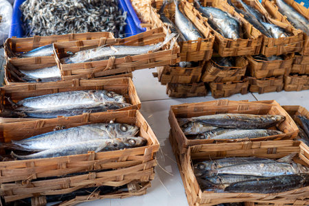 Ikan Pindang or salted fish in bamboo packaging on traditional market, in Yogyakarta, Indonesia