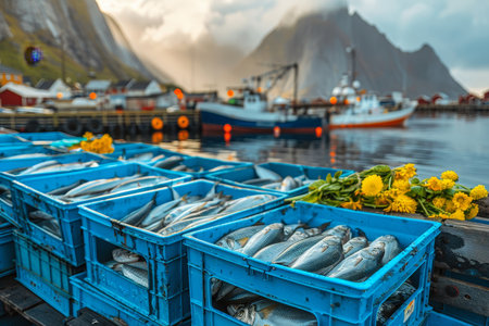 Close up of fresh fish in blue boxes at lofoten harbor surrounded by vegetables and flowers