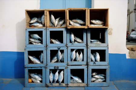 Captivating Sights: Fresh Caught Fish Safely Housed in Blue Crates Amidst the Breathtaking Scenery of Tarifa, Cadiz in Andalusia, Spain