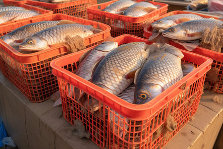 A box filled with freshly caught fish sits in a bustling market at dawn. The vibrant scales and bright eyes gleam as fishmongers prepare for their morning customers, showcasing the catch of the day.