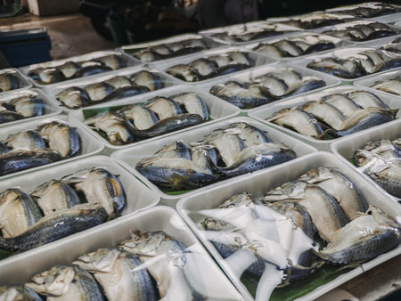 Thai mackerel wrapped in plastic foam at Amphawa floating market, Samut Songkhram, Thailand.