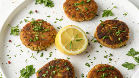 vegetarian cutlets with lemon and parsley on white plate