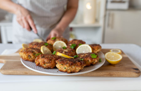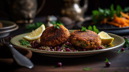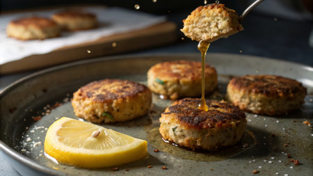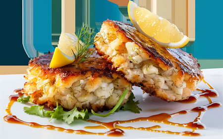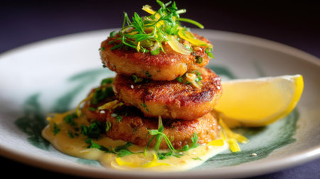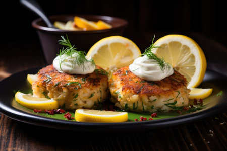 delicious crab cakes served with lemon wedges, created with generative ai