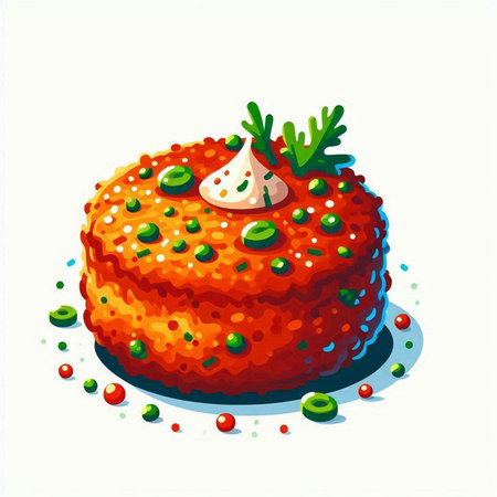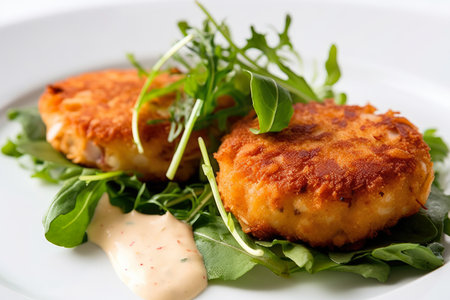 Close-up shot of spicy crab cakes topped with fresh arugula leaves and a dollop of horseradish sauce on a white plate, AI Generated