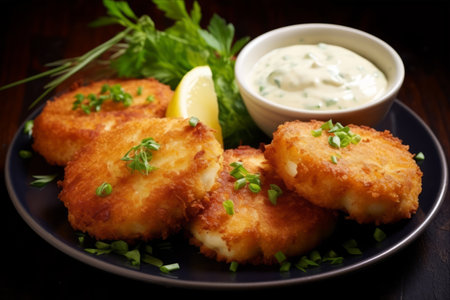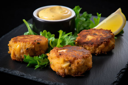 Macro shot of mini crab cakes served on a black slate with a side of mustard dipping sauce and lemon wedges, AI Generated