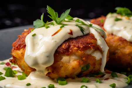 Macro shot of succulent crab cakes with visible chunks of crab meat and spices, topped with creamy aioli sauce, AI Generated