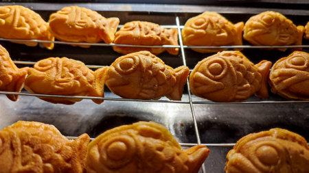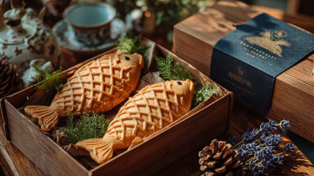 Captivating image of taiyaki fish-shaped pastries, beautifully arranged in a rustic wooden box, enhanced with natural elements to evoke warmth and comfort.