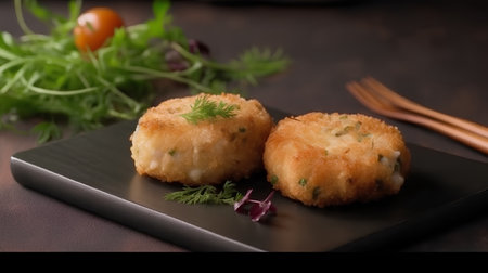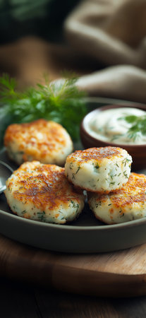 Potato fritters with herb garnish on rustic board. Inviting look for dinner or comfort food themes, ideal for hearty or homemade designs. Great for kitchen or savory visuals.