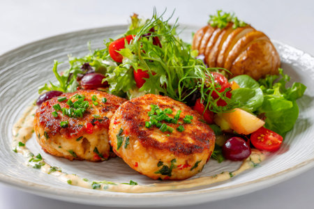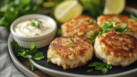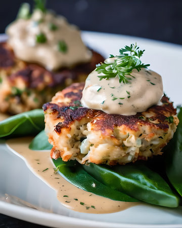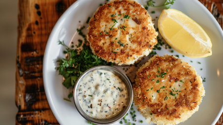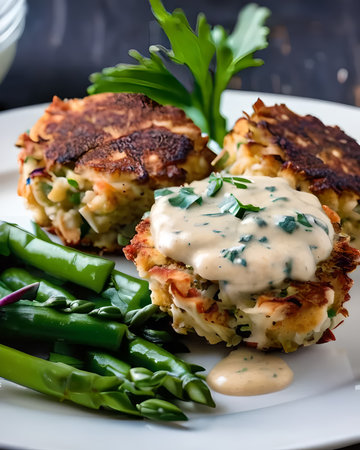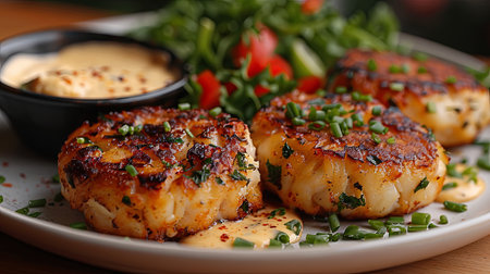 Savory crab cakes accompanied by creamy remoulade sauce and crisp vegetables on a plate