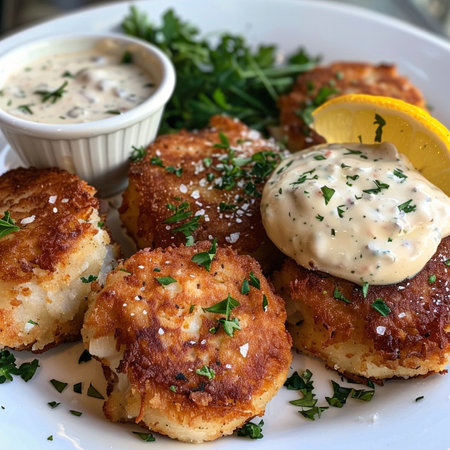 A plate of delicate crab cakes with a golden crust, served with remoulade sauce.
