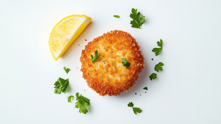 A crispy breaded cutlet served with a lemon slice and fresh parsley, showcasing an appetizing meal perfect for a delightful dining experience.