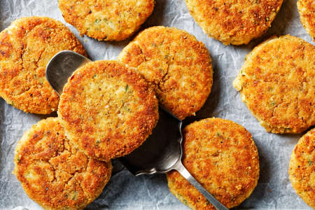 White fish cakes of white fish fillet: cod or haddock with potato and parsley, breaded in breadcrumbs and then baked in the oven, served on a sheet pan on a wooden background, top view, close-up