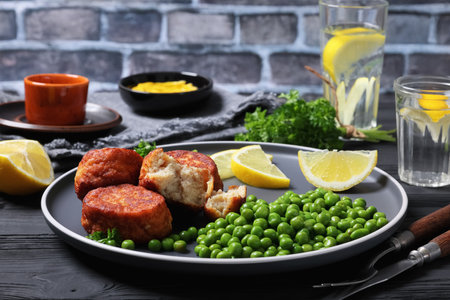 Danish atlantic cod fish cakes, fiskefrikadeller with green peas and lemon slices on a plate on black wooden table with brick wall in background, horizontal view from above, close-up