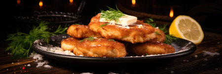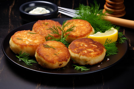 Fried fish balls or fish cakes on a plate with lemon and dill