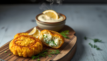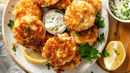 Close-up of crispy golden fish patties seasoned with fresh dill, served with creamy tartar sauce, offering a delectable culinary experience