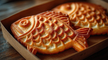 A delightful image of golden brown fish-shaped pastry nestled in a rustic wooden box, perfect for inspiring dessert ideas and adding charm to any culinary setting.