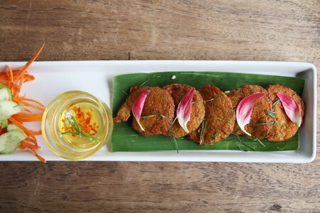 Thai Fried Shrimps Cakes on white plate with copy space