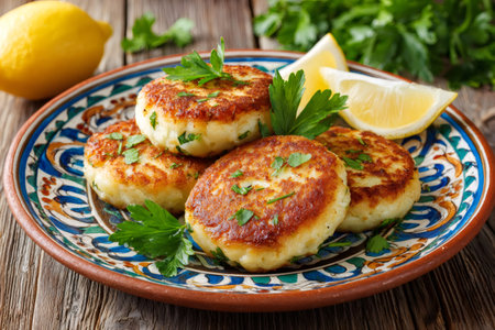 Fishcakes served on a vibrant plate, garnished with fresh parsley and lemon wedges, creating an appetizing culinary scene