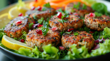 Vibrant salad with fresh lettuce, carrots, pomegranate, baked sweet potato and crispy tuna patties