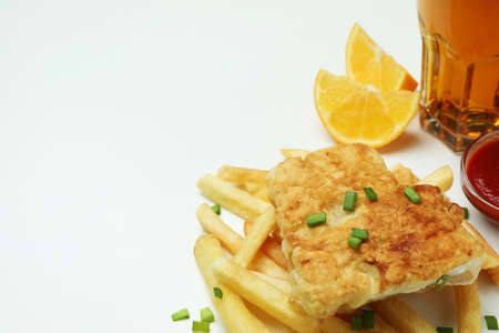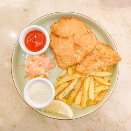 Traditional English Food - Fish and Chips. Fried fish filets and crispy French fries served with ketchup and homemade tarter sauce.