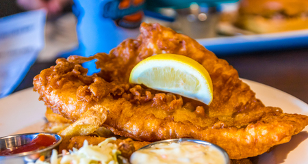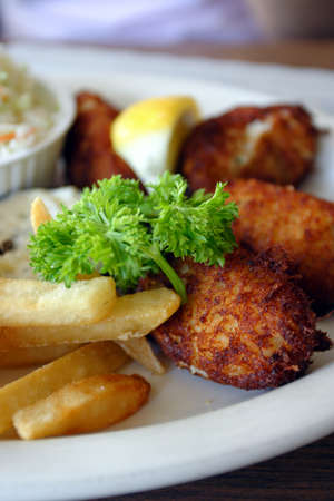 Delicious golden-brown fried fish fillets are served with crispy french fries, creamy coleslaw, tartar sauce and ketchup