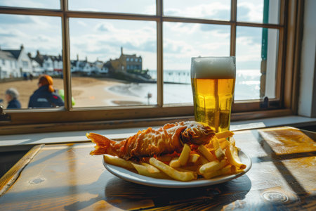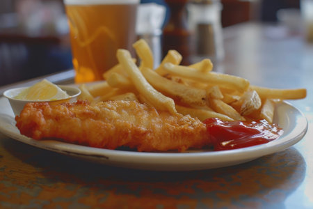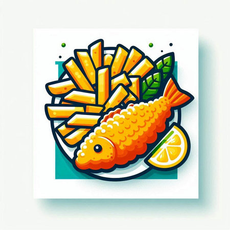 British Fish and Chips is a crispy and savory dish featuring golden and crispy battered fish, usually cod or haddock, served with a side of thick-cut and crispy French fries, and a sprinkle of salt and malt vinegar. The dish is garnished with a wedge of lemon and a side of tartar sauce. The lively and colorful seaside scene in the background creates a festive and vibrant atmosphere. The photo was taken with a 50mm prime lens on a full-frame camera using bright, natural lighting with a reflector to enhance the texture and colors of the food, creating a lively and festive mood.