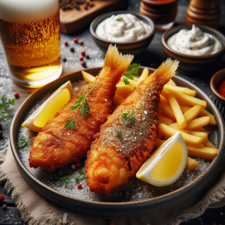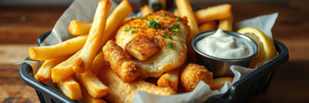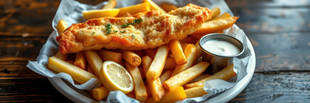 AI Generated. A crispy fish and chips platter served with tartar sauce and lemon wedges