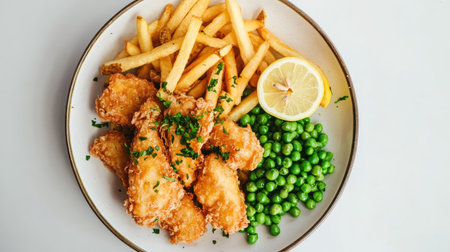 A vibrant plate featuring golden fried fish, crispy potatoes, and fresh green peas, garnished with lemon slices. Perfect for a delicious meal.