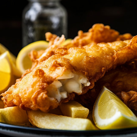 close-up image of golden crispy fish and chips on a plate, created with generative ai