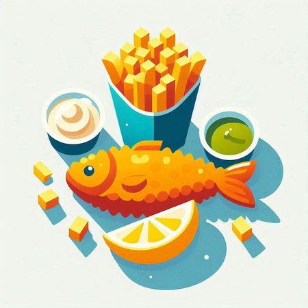 Fish, chips, lemonnnaise and sauce. Vector illustration.