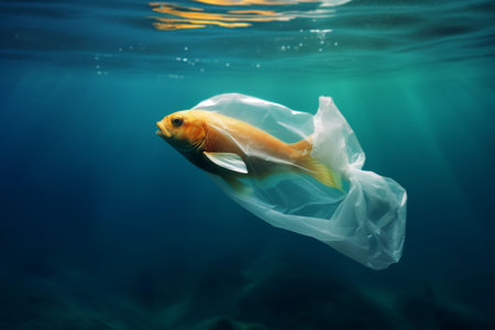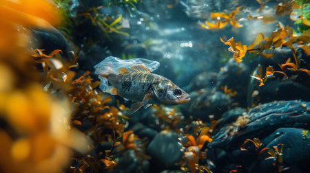 World Oceans Day. Dead fish in a plastic bag, concept to protect the oceans. The death of marine animals, copy space