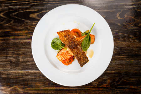 Salmon steak on a vegetable pillow. In a plate. Selective focus