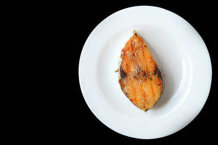 Salmon fish steak cooked. Dinner seafood dish plate. Grilled salmon with lemon, delicious lunch. Isolated roast fish portion, healthy bbq recipe, restaurant cuisine. Crispy norwegian salmon, dark, top
