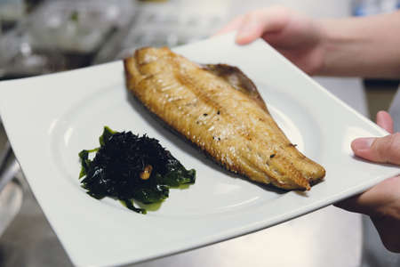 The waiter is holding a plate Dorado with arugula and lemon. BBQ seafood. Restaurant menu
