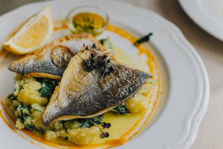 Close-up of a fish dinner in a sophisticated restaurant, immersing viewers in the cozy and elegant dining experience.
