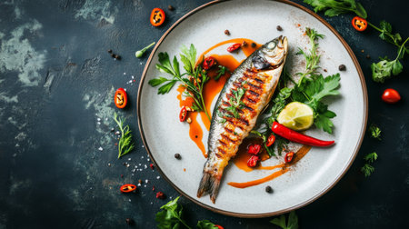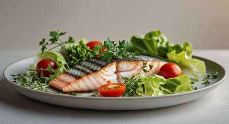 AI Generated. Grilled Fish Plated with Fresh Vegetables and Herbs