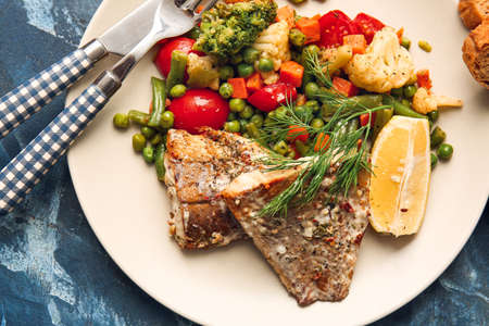 Plate with tasty baked cod fillet and vegetables on color background, closeup