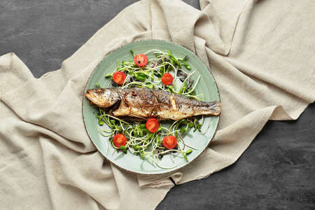 Plate with sea bass fish, microgreens and tomatoes on dark background