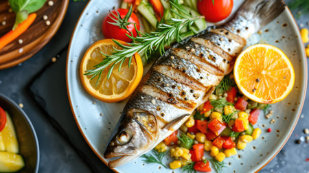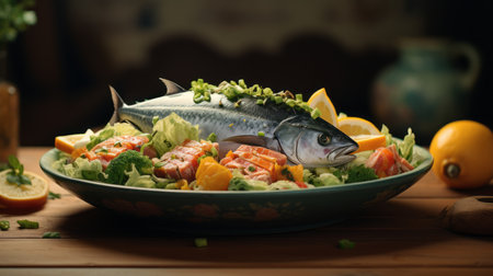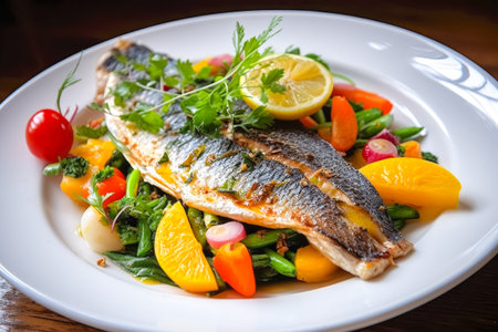AI Generated. Grilled Fish Plated with Fresh Vegetables and Herbs