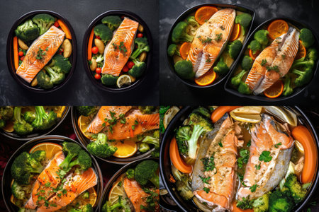 Baked Salmon Fillet Collage, Red Fish Steak, Roasted Seafood Steak, Baked Salmon Portion Top View, Abstract Generative AI Illustration