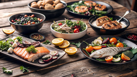 A colorful and healthy spread of various dishes including fish, salads, and vegetables on a rustic wooden table setting.