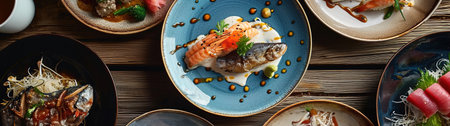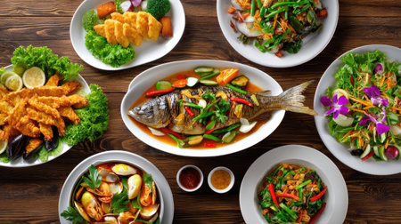 Experience the vibrant array of seafood dishes featuring grilled fish, salads, and fried delights, all beautifully arranged on a rustic wooden table, inviting you to indulge.