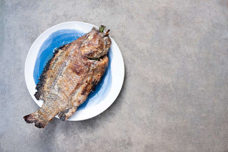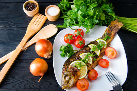 Grilled Dorado fish on a white plate, garnish fried potatoes. Dark background, top view