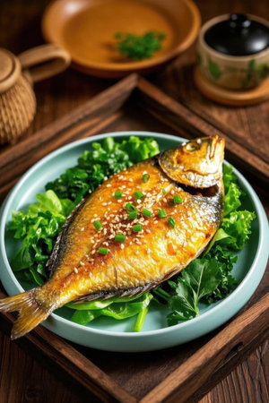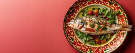 Whole roasted fish garnished with fresh parsley and cherry tomatoes, served on a red and gold plate. Chinese New Year wide banner with copy space. Ai generated
